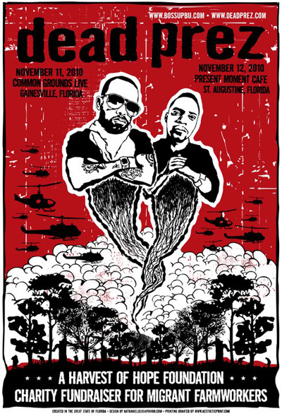 On Nov 12th, the hip-hop duo Dead Prez played a benefit show for the Harvest of Hope Foundation in Saint Augustine, Florida. I have been a DP fan since high school when I first heard their album Let’s Get Free. Their brand of lyricism blends political consciousness about issues such as the prison industrial complex, police brutality, Pan-Africanism, and class struggle with hopeful messages about organizing, practicing martial arts, and eating a healthy diet.