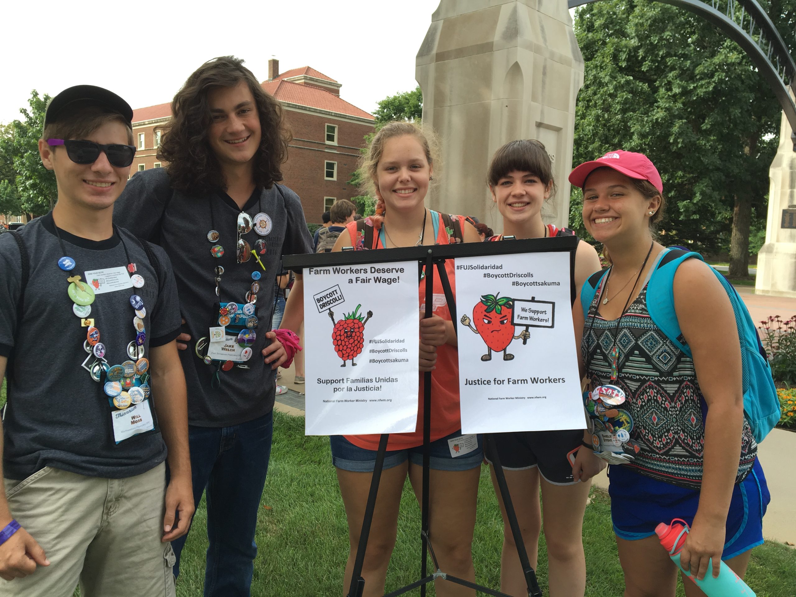 On the last day of the event, July 22nd, there was an Advocacy Walk around the campus. During the Walk participants had the opportunity to stop at stations along the way to learn about national and global missions of the CPC and PCUSA. National Farm Worker Ministry sponsored a station which was focused on the Berry Boycott of Sakuma Brothers and Driscoll’s. Over 100 young Presbyterians signed a petition which went to the CEOs of both companies urging them to support a fair contract with FUJ. In addition, the walkers took selfies in support of the boycott and blew up social media with the hastags #FUJSolidaridad, #BoycottDriscolls, #Boycottsakuma !